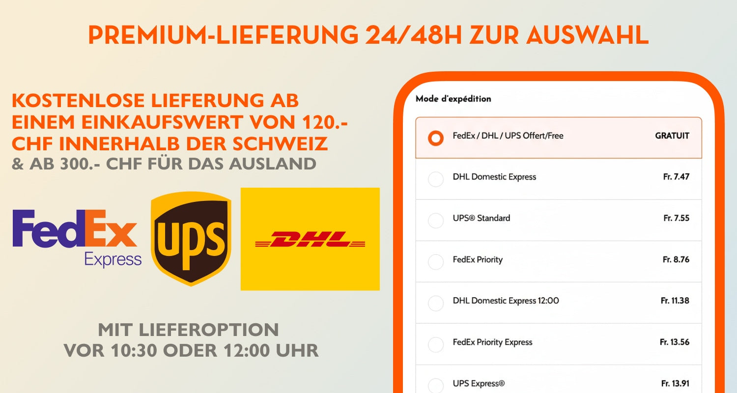 Wir versenden Ihre Bestellung je nach Wunsch mit DHL, UPS oder FedEx für eine besonders schnelle, sichere und hochwertige Lieferung. Die 24-Stunden-Lieferung kostet mindestens CHF 7 und ist ab einem Bestellwert von CHF 120 kostenlos.